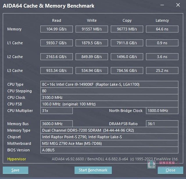 AIDA 64 的處理器和記憶體快取相關資料,記憶體頻率是 DDR5-XMP 7200 ,讀取 104.99