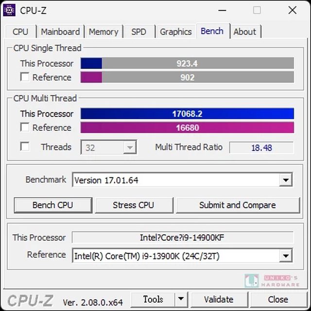 CPU-Z 單核心分數為 923.4、多核心分數為 17068.2。