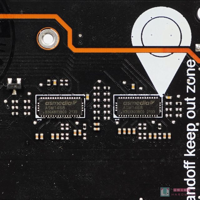 2 顆 ASMEDIA ASM1468 PCI-E 3.0 X2 通道中繼器晶片,負責由 Z790 晶片組至 JHL8540