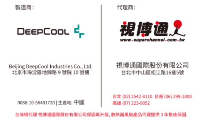 在此鄭重聲明,DeepCool九州風神經由”視博通國際股份有限公司” 代理引進台灣市場銷售的唯一官方代理商”, 所有销售的產品彩盒均貼有包含製造商以及代理商訊息的標籤貼紙 樣例如下圖所示 https://i.imgur.com/0dGIPUZ.png
