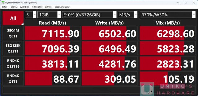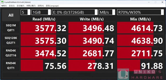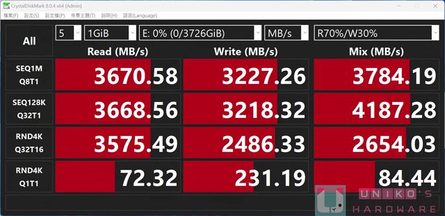 主機板 (指定使用 PCI-E 4.0 X4 插槽),經 CRYSTALDISKMARK 測試,最終跑出 READ 3670