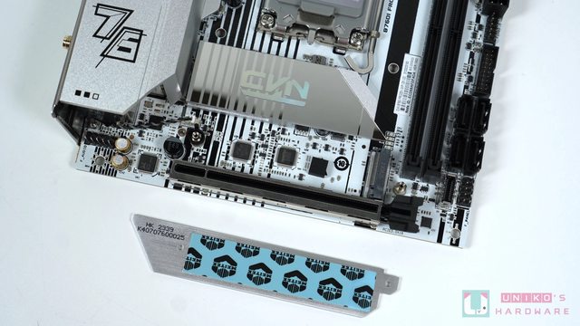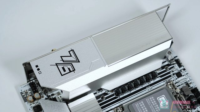 右下方是銀色磨砂材質的 M.2 散熱片,七彩虹這種作法有別於台系板廠慣用的垂直堆疊設