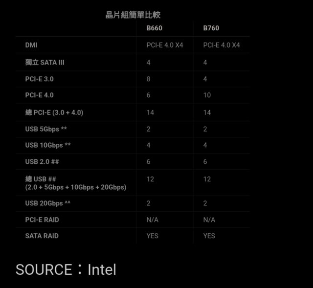 主要的規格包括與上代 (B660) 相同的 DMI PCI-E 4.0 X4、4 個內置 SATA 控制器、14 組