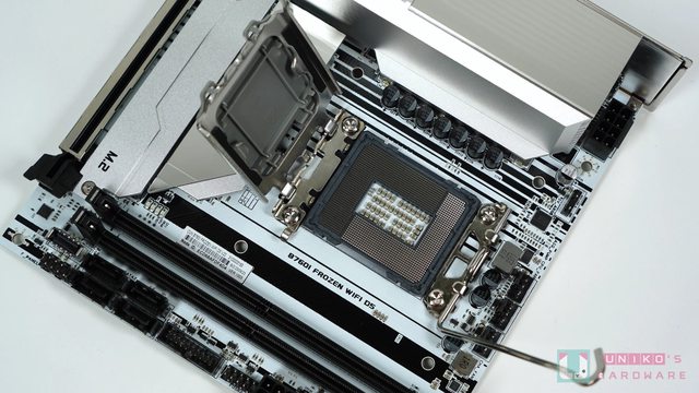 管 CPU 蓋子以保護下方插槽。CPU 插槽內和背面同樣塞滿了小小的 MLCC,應該與那個 TRA