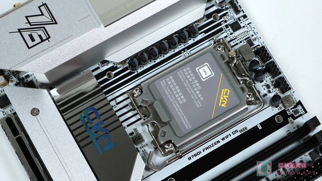 CPU 插槽下方的金屬散熱片是晶片組的部份,除了以結構色替"CVN"系列字樣做出識別,
