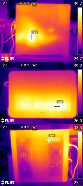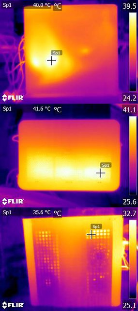 ▼風扇配置三:CPU+GPU高負載30分鐘後的左側(上)、頂部(中)及右側(下)紅外線熱影像