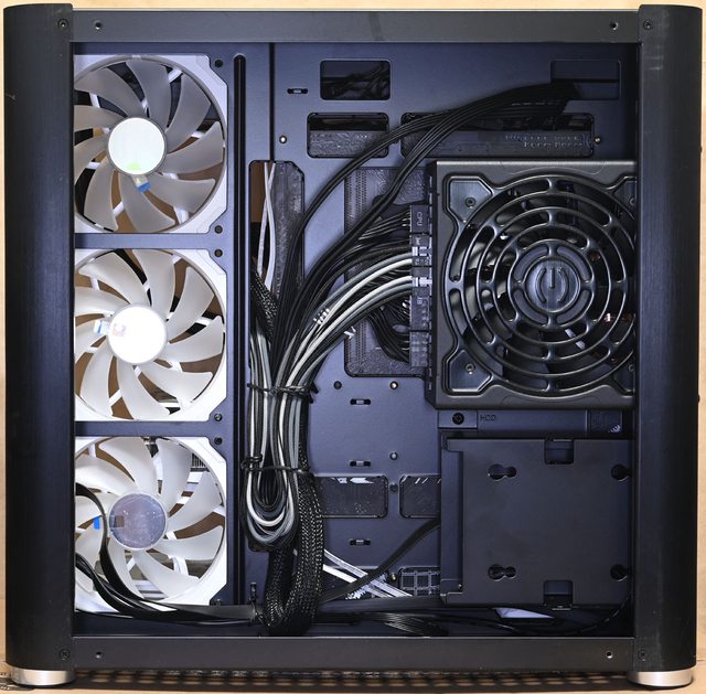 ▼風扇配置一:右側前方3個JONSBO ZG-120魔組扇進氣,底部3個JONSBO ZG-120R反轉魔