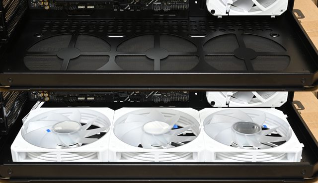 ▼安裝3個JONSBO ZG-120魔組扇(右側前方)及3個JONSBO ZG-120R反轉魔組扇(底部)的正