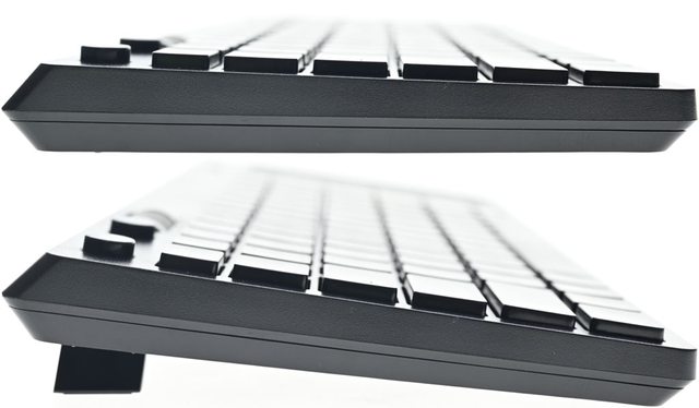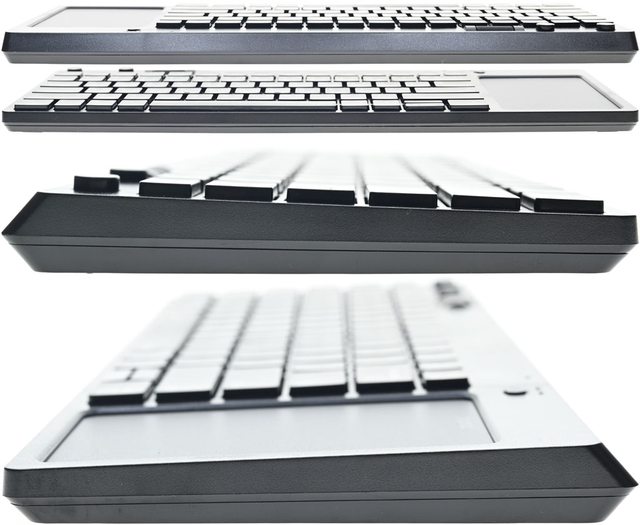 ▼鍵盤正面按鍵區78個巧克力鍵帽採緊湊布局,右側有大面積觸控板。鍵盤背面有5個長