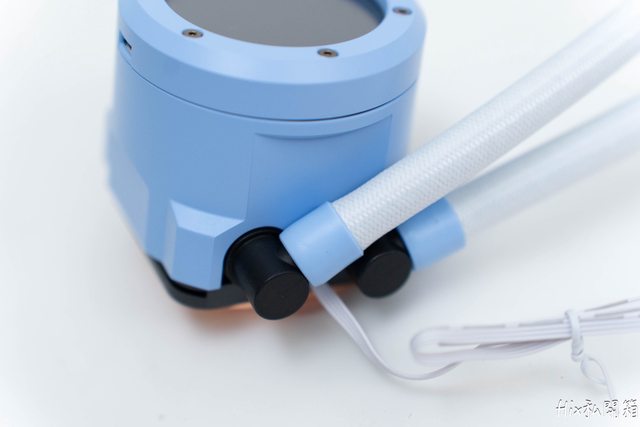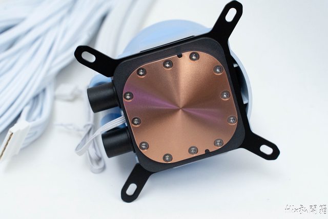 配件本身全部黑色的,冷頭及冷排則是繡球花藍