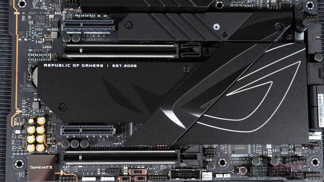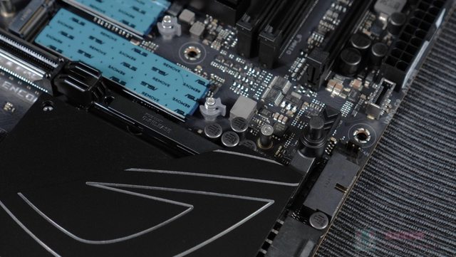 保護蓋上當然也要有 ROG 信仰!整張主機板最搶眼的 ROG 敗家之眼座落在晶片組散熱器上