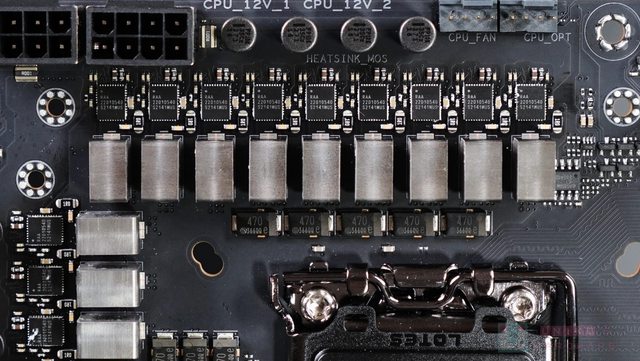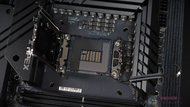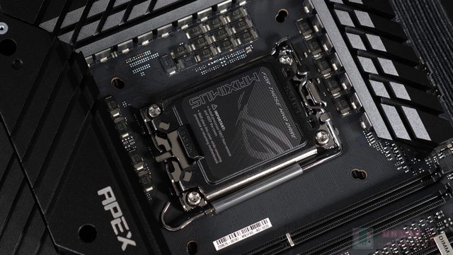 左上巨大的 VRM 散熱器有 ROG 和 MAXIMUS APEX ENCORE 字樣驗明主機板正身,CPU 插座