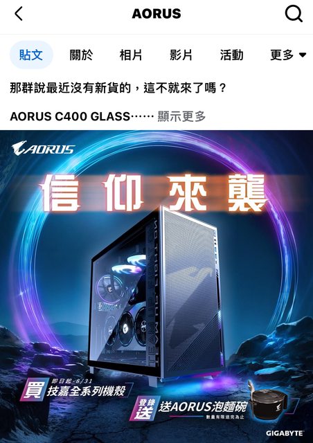 3.其他活動 AORUS 全系列產品抽OLED螢幕 4.AORUS FO32U2P DP2.1 補貨 蝦皮、原價屋都有 原價屋送 【活動】購買 技嘉 FO32U2P ~加贈 32吋原廠專屬螢幕保護套 ~ *數量有限.送完為止... 主板不貴,蠻好看 號稱全球首款AMD 白化ATX BTF 背插 微星跟華碩都沒有可以對標的型號。 那機殼送泡麵碗是怎樣啊? ----- Sent from JPTT on my iPhone -- ※ 發信站: 批踢踢實業坊(www.ptt-web.org.tw), 來自: 111.71.42.57 (臺灣) ※ 文章網址: https://www.ptt-web.org.tw/PC_Shopping/M.1721549233.A.E98