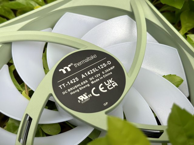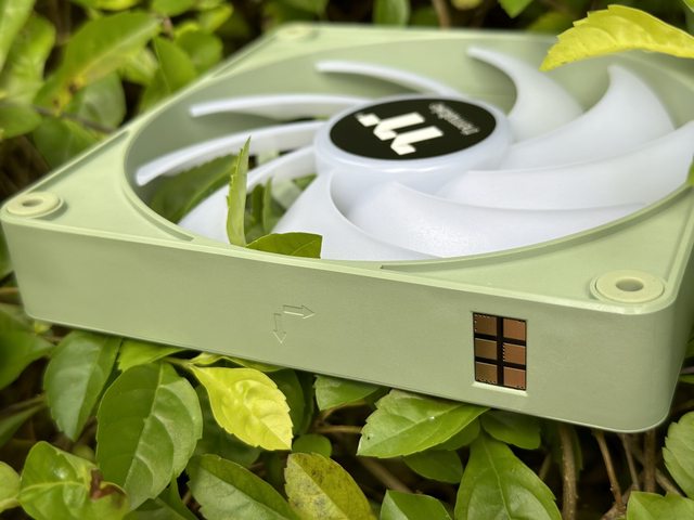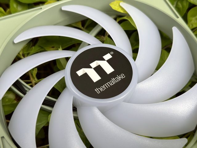 以正轉風扇作介紹,正面軸承處貼有黑色TT LOGO貼紙,個人覺得如果也用抹茶綠的貼紙