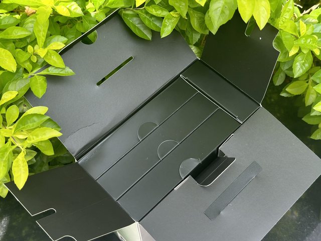 內部以黑色紙質材料區分風扇及配件包。