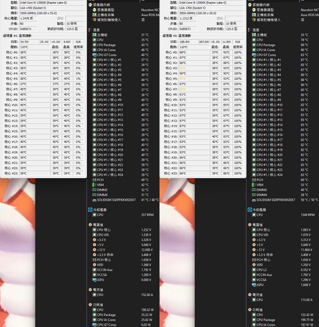 ▼待機(左)及高負載(右)的CORE TEMP及AIDA64感測器畫面
