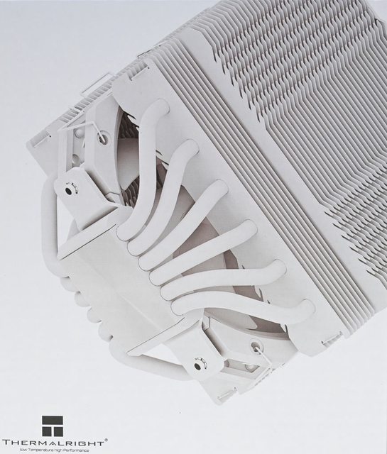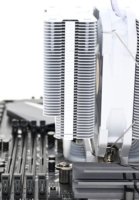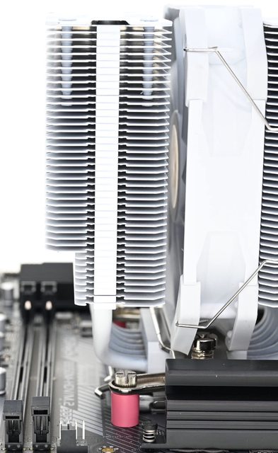 42層高密度鰭片,最下方8片鰭片裁切以閃避記憶體,熱導管與鰭片均採全白處理,頂部