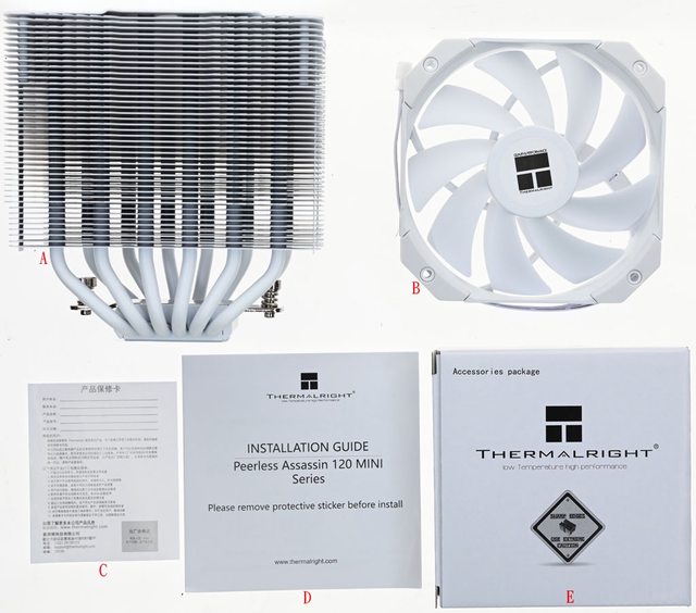 ▼包裝內容有散熱器(A)、TL-D12W風扇(B)、保證卡(C)、安裝說明書(D)、安裝配件盒(E)