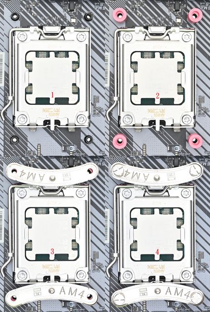 熱器托架拆除,只保留原裝散熱器背板(1),將4個紅色AMD套管套進原裝散熱器背板鎖點