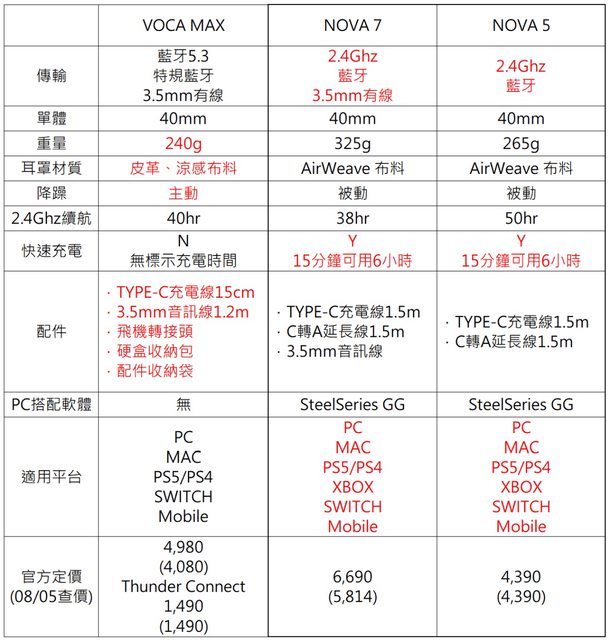 還是簡單比較一下手上這三款耳機的規格,雖然NOVA 5可以視為NOVA 7的降規格版本,但