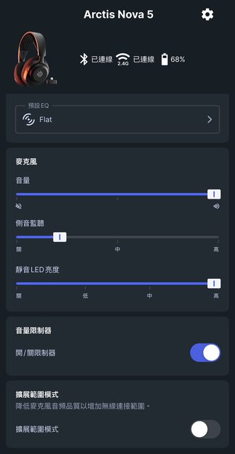 的EQ,也能設定麥克風音量、側音(是否監聽麥克風聲音)、麥克風燈號及音量限制器等功