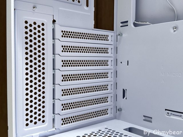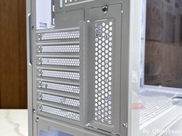 採用可重複使用的PCI-E檔板,以平價機殼來說值得鼓勵,也設有能遮蓋PCI-E槽螺絲的檔