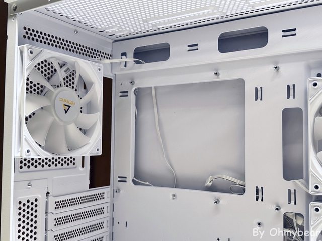 後方預裝一顆120mm正向扇葉風扇排風,頂部空間有稍微抬高,安裝厚冷排沒問題。