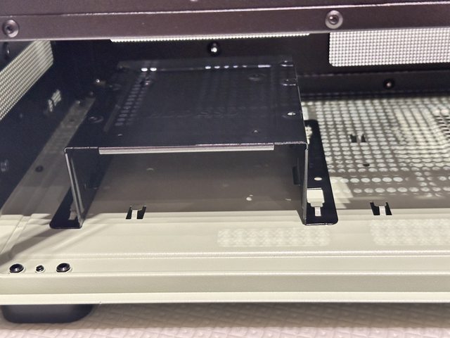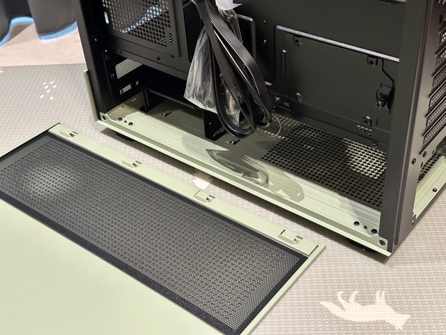 底部於電源倉位置配置小片PVC磁吸濾網,硬碟架有兩段可調空間。