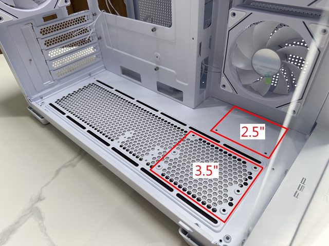 機殼底部如不安裝風扇,前方還留設有3.5" HDD及2.5" SSD安裝位置各一可供運用,其中