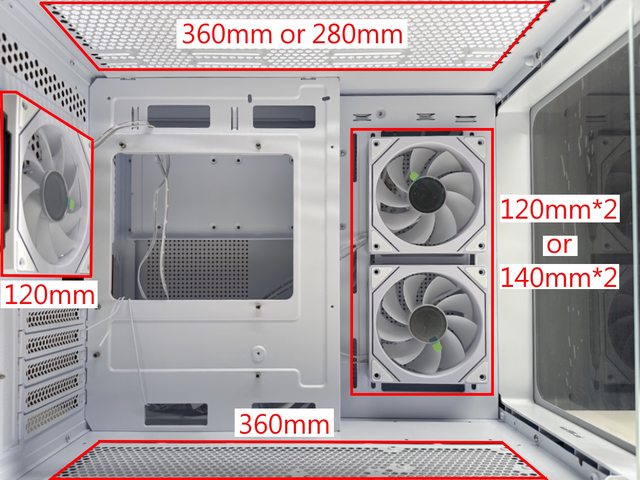 但側邊風扇架最高可裝140mm風扇。散熱配置上方水冷最高可裝360mm尺寸,空冷則是
