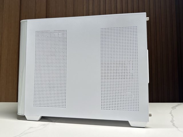 另一側為金屬側板,並針對機殼風扇及電源風扇設置兩處通風開孔,因開孔孔徑較小故內