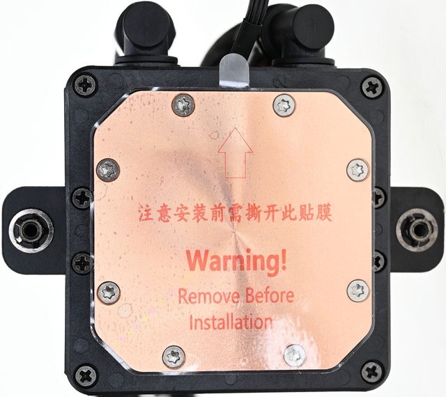 ▼水冷頭處理器接觸面有一張保護貼,上面印上"注意安裝前需撕開此貼膜"中文及"警告