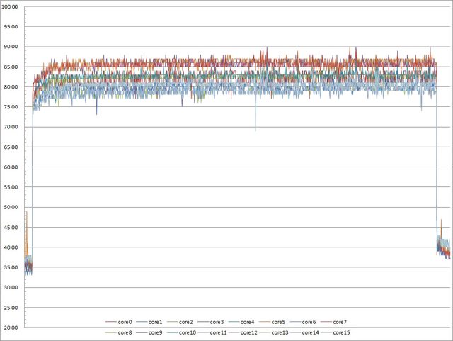 ▼功耗限制240W下高負載30分鐘CORE TEMP溫度記錄圖