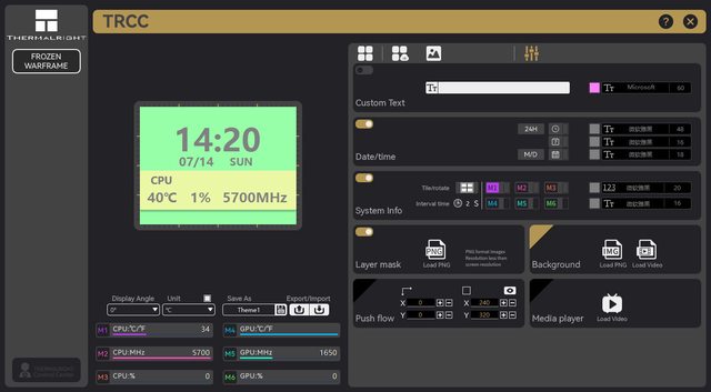 ▼TRCC軟體畫面,左邊條狀區域顯示商標及已連接裝置;中間區域顯示水冷頭螢幕預覽畫