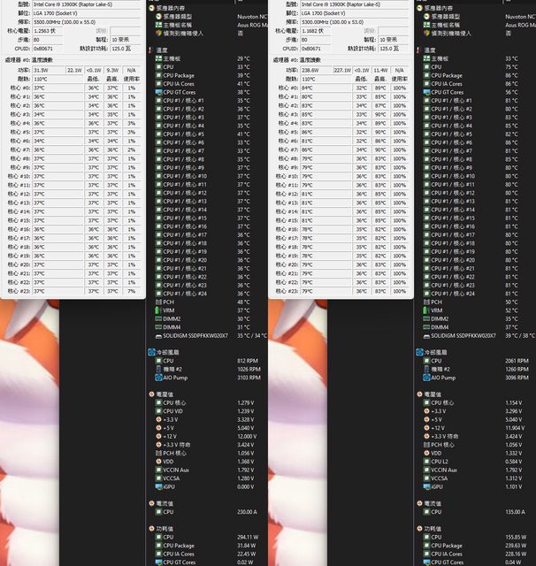 ▼功耗限制240W下待機(左)及高負載(右)的CORE TEMP及AIDA64感測器畫面