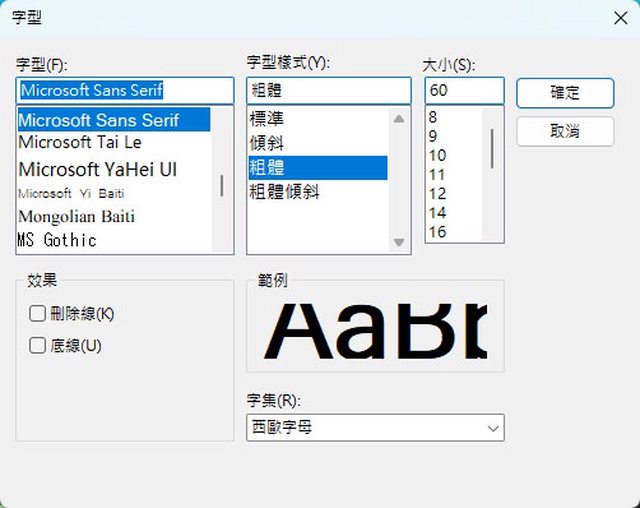 ▼點擊設定項目中的字型/大小方塊,會出現字型調整頁,可設定字型、字型樣式、大小
