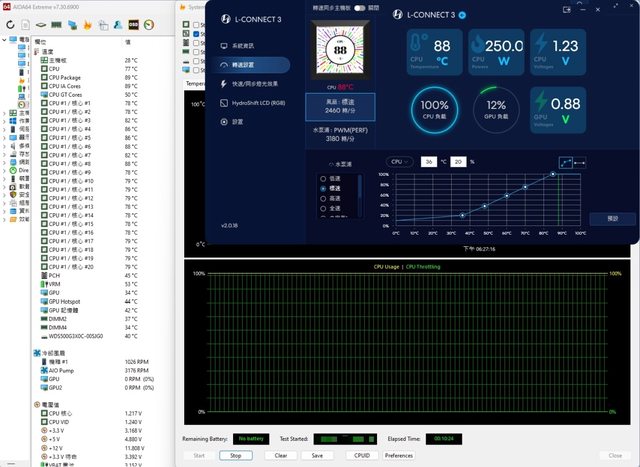 經單烤FPU10分鐘後,測得Package溫度約88~89度,P核心平均約83.5度,水冷風扇轉速顯