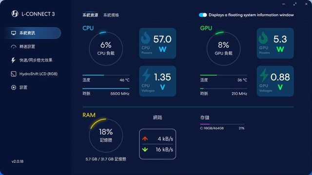 L-Connect 3整合硬體監控及聯力設備設置功能,主頁面顯示當前系統資訊。