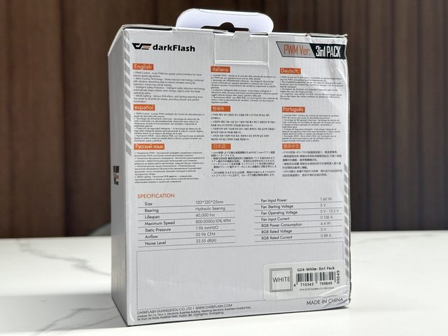 背面包含多國語言特色介紹及風扇硬體規格,G24具PWM控轉功能、偵測異物自動停轉及