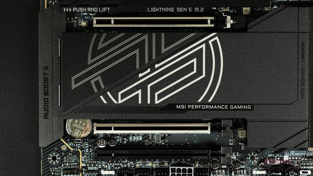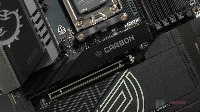 GEN5 M.2 散熱器的表面有一個 MPG 小 LOGO 及 CARBON 字樣 (可發光),側邊標示 LIGHTN