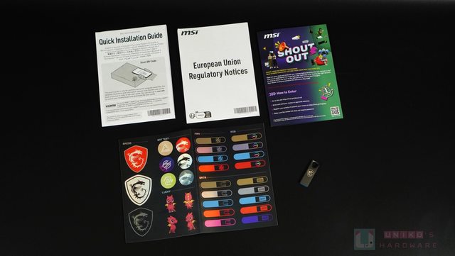 、一張微星信仰標籤貼紙、一份 MSI SHOUTOUT 活動的介紹,還有一支印著微星龍盾的隨身