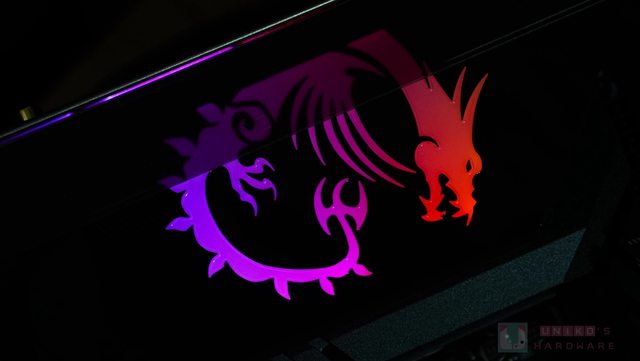 裝甲上有可發光、微微立體突起的微星龍紋,以及 MSI 字樣,延伸朝向 I/O 有一塊半透明