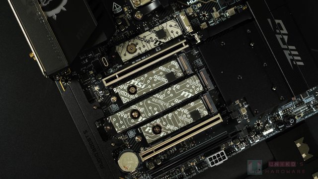下半區塊有音效區域的金屬裝甲、主 GEN5X4 的 M.2 散熱器、以及能覆蓋住另外四組 M.2