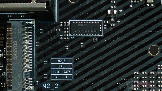 ‧ M2_2 插槽的右邊,有 1 顆 SN75LVPE5421 中繼器晶片,負責 CPU 至 M2_1 之間的訊