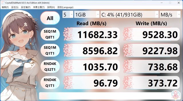 最大讀取速度為11682 MB/s,最大寫入速度為9528 MB/s(為什麼不是9527)