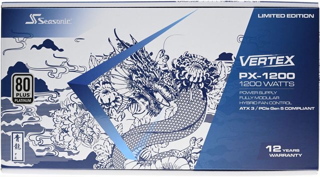 ▼外盒右側面有Seasonic商標、青龍甲辰落款、龍圖案、VERTEX標誌、PX-1200名稱、
