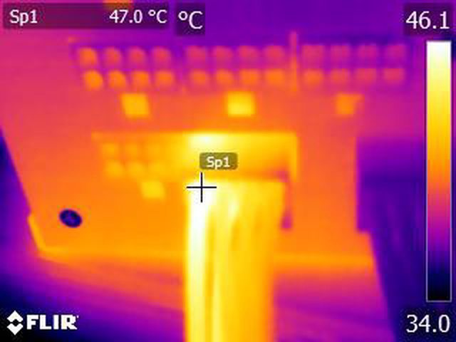 ▼單條EPS 4+4P連續輸出28A(336W)10分鐘後的電源端模組化接頭紅外線熱影像圖(附註: