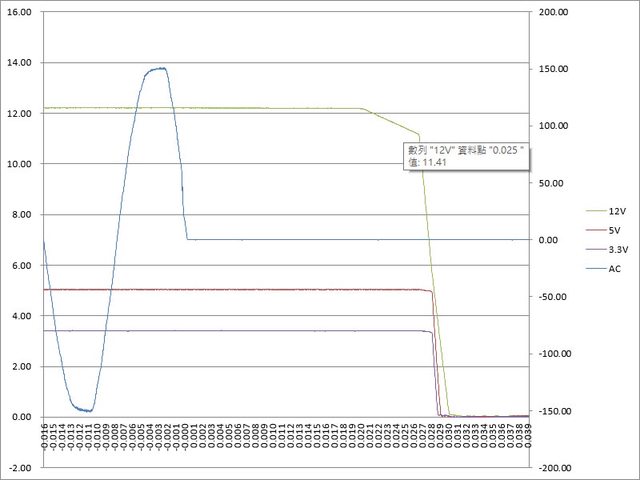 ○綜合全負載輸出狀態切斷AC輸入模擬電力中斷,12V於20ms開始壓降,25ms降至11.41V