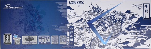 ▼外盒左側面有VERTEX標誌、青龍甲辰落款、Seasonic商標、PX-1200名稱、產品規格表