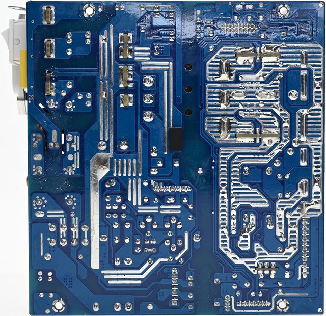 ▼主電路板背面沒有任何元件,焊點做工良好,部分大電流路徑有敷錫